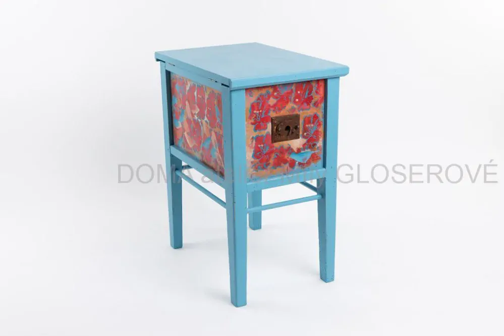 Stolek s odklápěcím víkem, pod nímž se skrývá úložný prostor, byl původně máselnicí. Touha pomalovat ho pestře, byla veliká. A tak vznikl kousek pro odvážné. Kousek s "temperamentem Carmen".