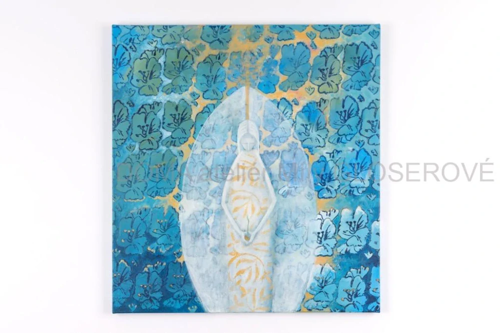 Malba akrylovými barvami na lněném plátně má rozměry 65 x 70 cm.