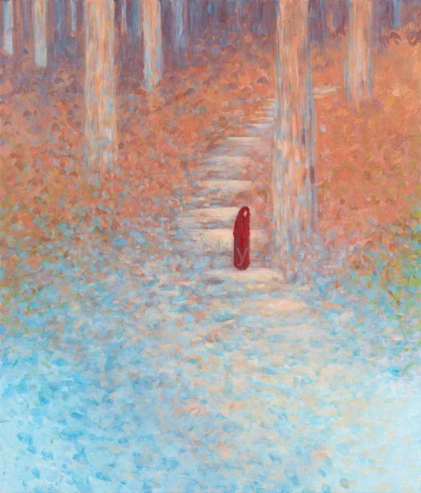 A víte, co mne inspirovalo k malbě této kompozici stromů a postavě scházející ze schodů?Fotografie na níž syn Vilém schází z kamenných bloků k vodní hladině řeky Loučné na dětském hřišti na valech v Litomyšli. Kompozičně a barevně inspirativní záběr spustil cestu malování čtyř obrazů s tímto motivem. Snažila jsem se postupným ubíráním a zjednodušováním motivu dostat k tušenému tady a teď.