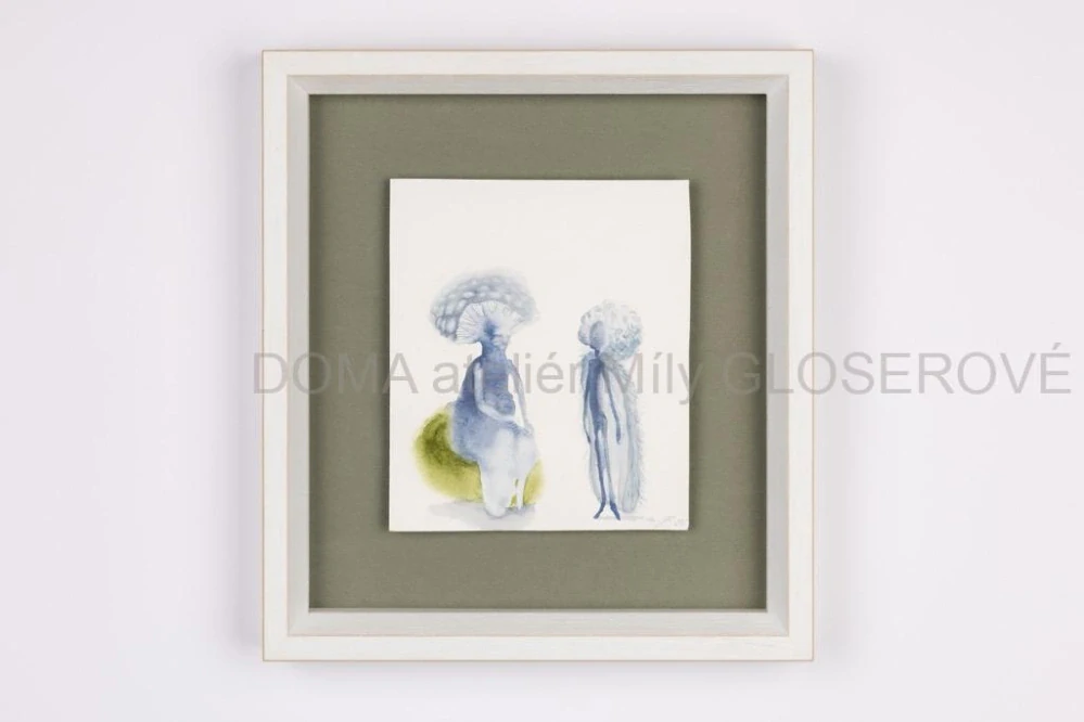 Tato volná ilustrace je vytvořená technikou akvarelu. Obrázek je kvalitně zarámován v dřevěném rámu s bílou patinou.