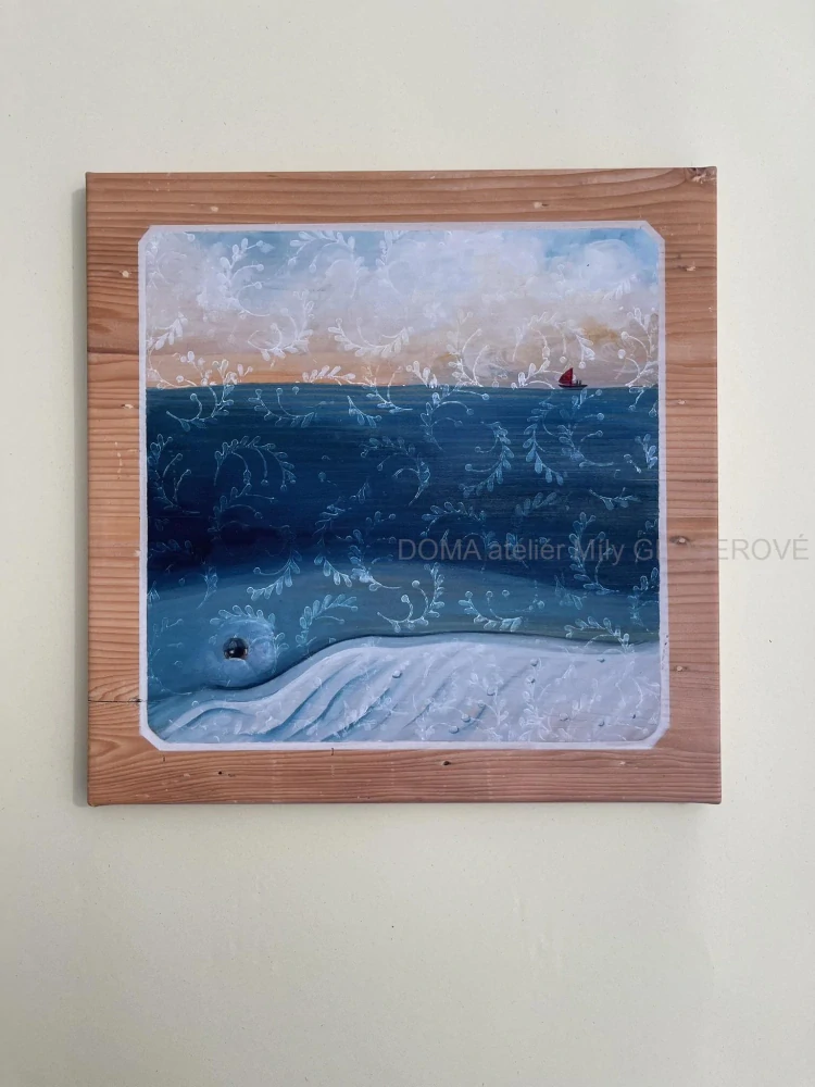 Originál obrazu je malován akrylovými barvami na starou dřevěnou štorkli, která již dělá radost nové majitelce.