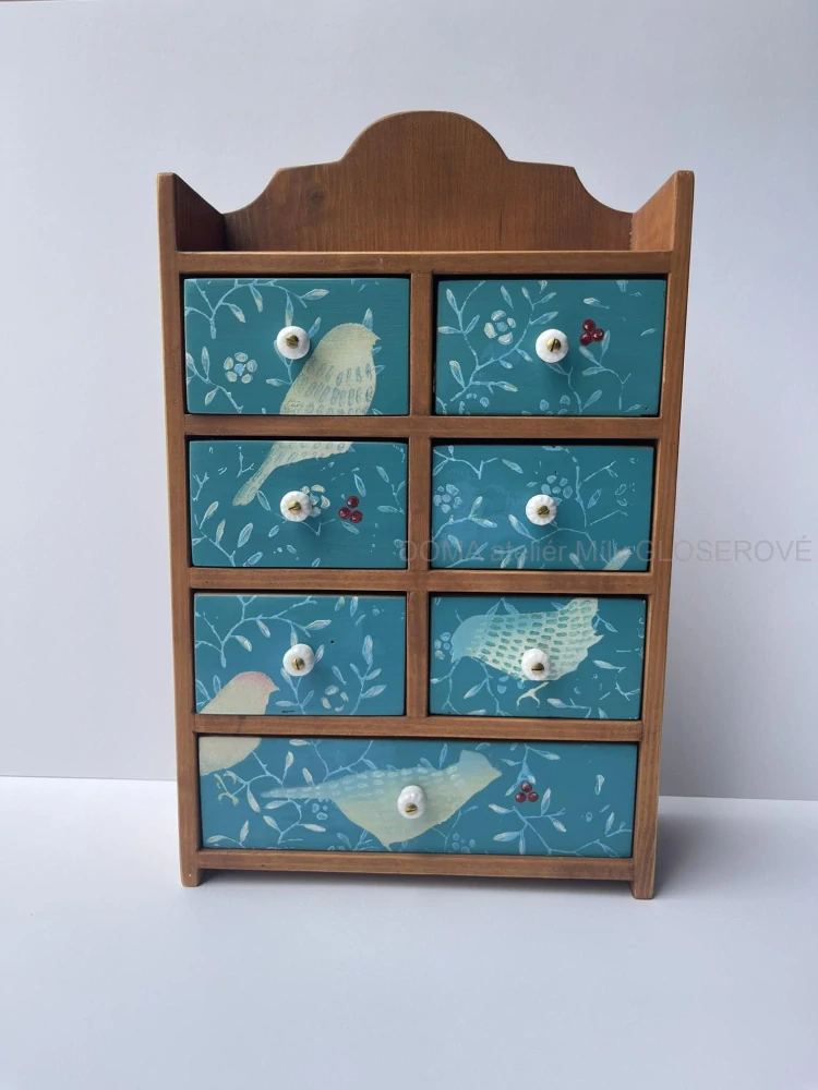 Malba na čelech šuplíčků je vytvořena akrylovými barvami a ošetřena závěrečným lakováním.