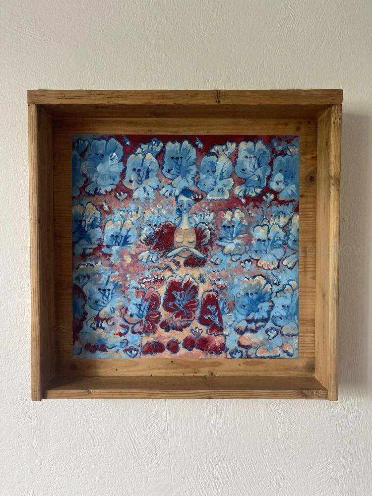 Obraz je malovaný akrylovými barvami s využitím otisku malířského válečku s mým oblíbeným motivem květů. A pro pó o jaký druh květin se jedná? Pomůžete mi identifikovat tuto záhadu? :D